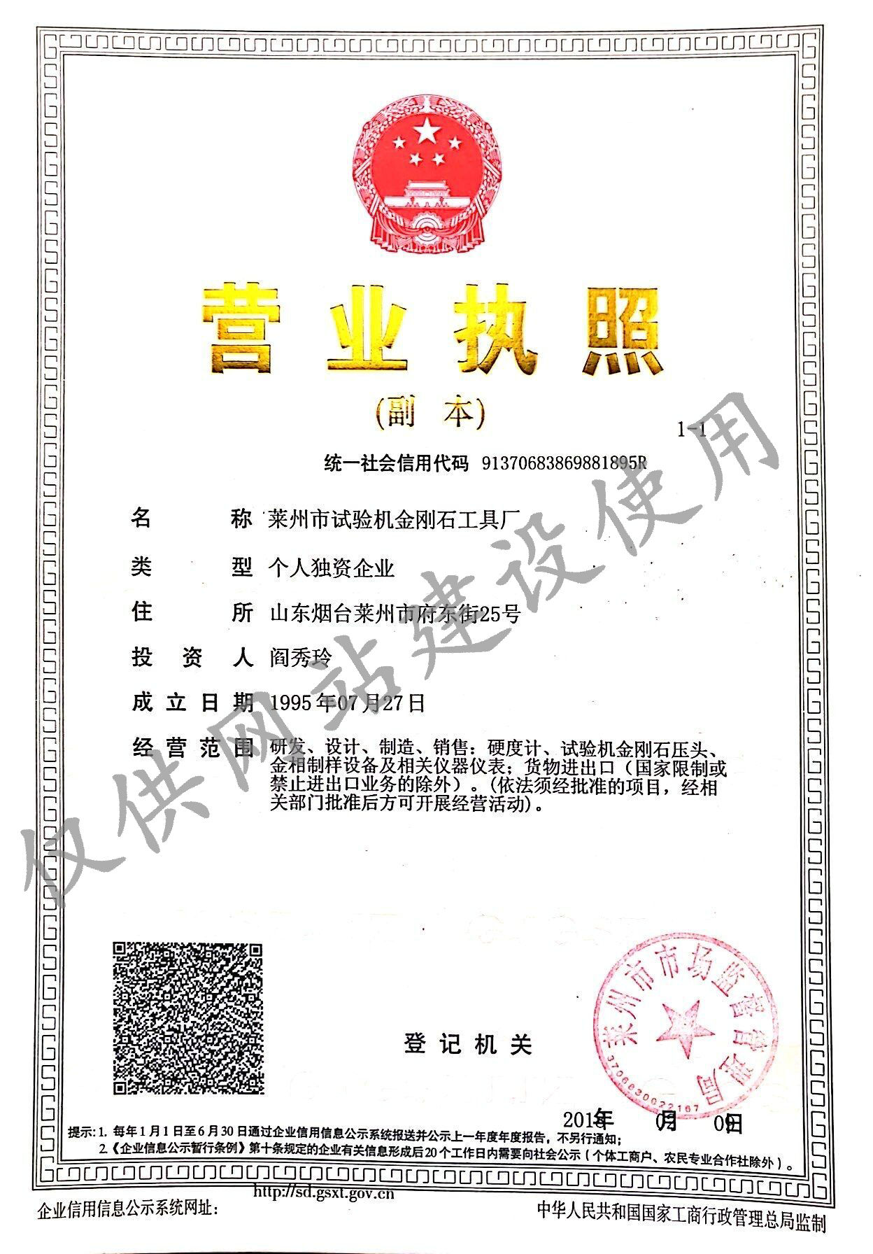 萊州市試驗機金剛石工具廠是我國早期一批成立的、規范取得計量器具生產許可證的正規生產廠家(CMC量制魯字06250117號),注冊商標為【萊金】。自建廠以來始終以掌握核心技術、力行精細加工、注重技術創新、質控嚴格苛刻在業界馳名,經過近30年的勵精圖治,現已形成標準化和系列化的各類國優級硬度計、金剛石壓頭、光學儀器等計量檢測產品。
